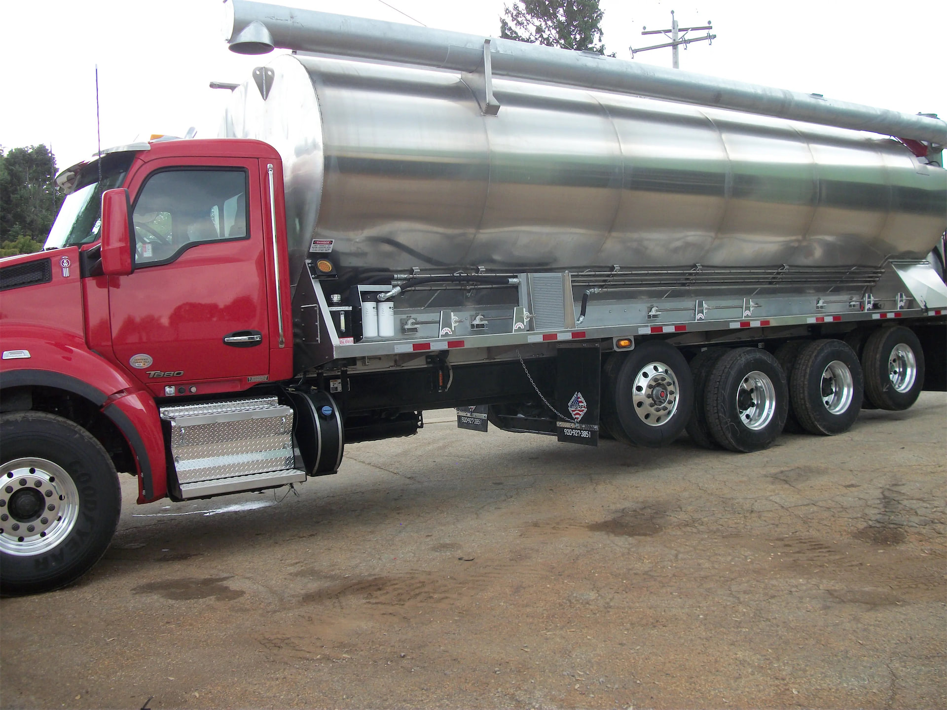 - Mud flaps in front of pusher axle